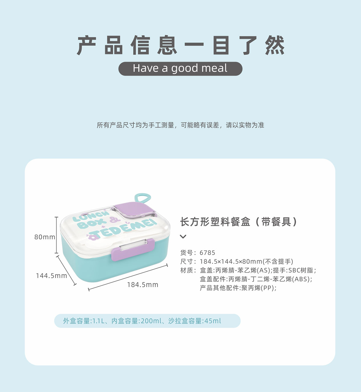 Size: 185*145*80mm/外盒:1.1L/內盒:200ml/沙拉盒:45ml