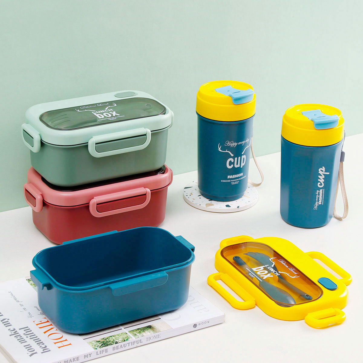 品悅長方單層密封飯盒(1000ml)+圓形/八角隨行杯(500ml)