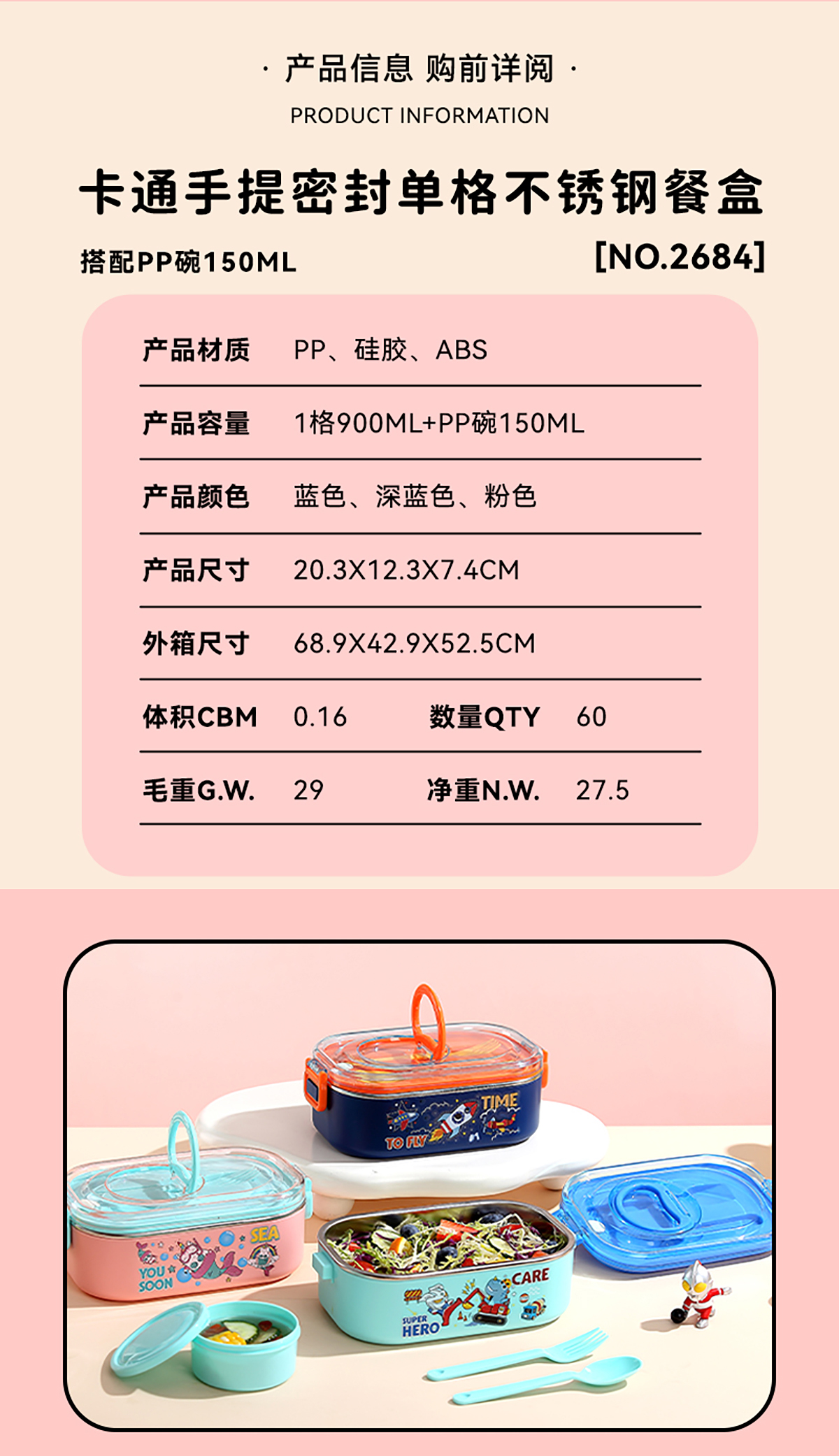 卡通手提密封不銹鋼餐盒(單格900ml/2格850ml+PP碗ml/2格850ml+不銹鋼碗150ml)